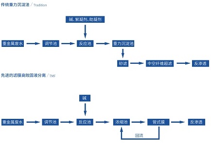 傳統(tǒng)工藝處理重金屬廢水,一般采用傳統(tǒng)化學(xué)沉淀,不僅需要占地面積較大的沉淀池或澄清池,還需要投加大量的化學(xué)藥品。不僅增加了水的離子成分,殘留的PAM還會穿透反滲透膜引起不易恢復(fù)的污堵。