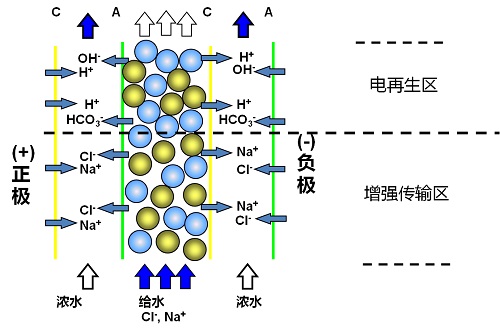 EDI電流密度的增加以及淡水室中樹脂表面水解離不斷產生的氫離子和氫氧根離子,可使淡水室的局部pH值發生變化,在特定的地方產生高pH區和低pH區。這些極端pH值區被認為是在EDI模塊內部創造了一個特定的有利于抑制細菌的快速繁殖的環境,尤其是在產水側,他們是非常關鍵的。 同時,由于陰離子交換樹脂表面帶正電荷,而細菌(尤其是對制藥用水影響較大的革蘭陰性菌)帶負電荷,使其易被吸附到陰離子交換樹脂表面,處于水解離最活躍的部位。從而使其生長受到抑制甚至被殺滅,大大減輕了EDI產水受細菌內毒素污染的程度。