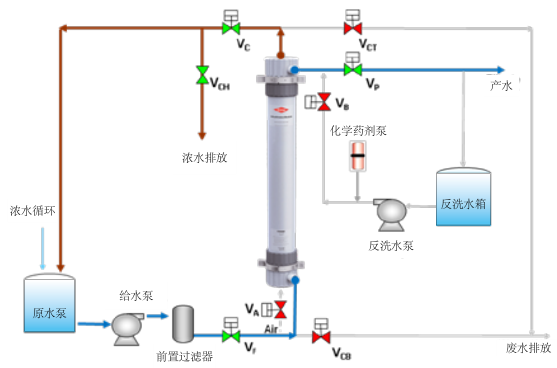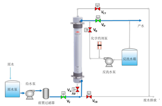 濃水排放過濾和錯流過濾模式操作同樣需要定時氣擦洗、水反洗和正洗以及定期的化學清洗來恢復超濾膜過濾性能。