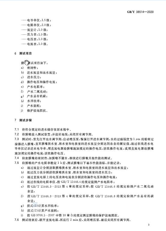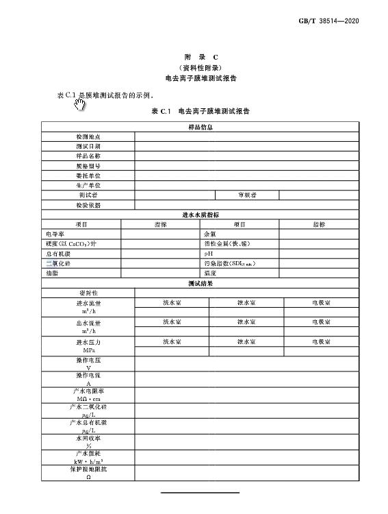 《電去離子膜堆測試方法》GB/T 38514-2020于近日發布,2021年2月1日起施行。